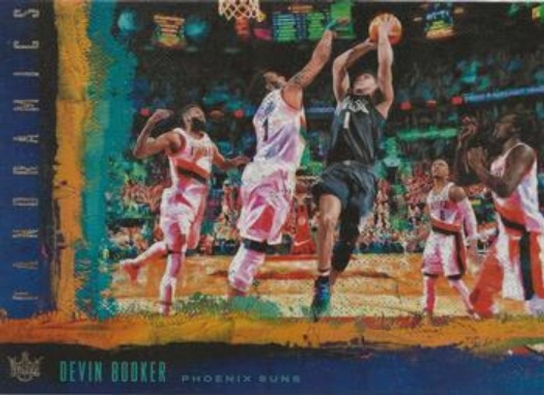 The Devin Booker 2017 Court Kings #10 Box Topper Panoramics card is 1 of 14 Devin Booker's card variations in the 2017 Court Kings set being tracked by Sports Card Investor, including Base, Sapphire /25, Masterpiece /1, Emerging Artists, and Artistic Endeavors /299.