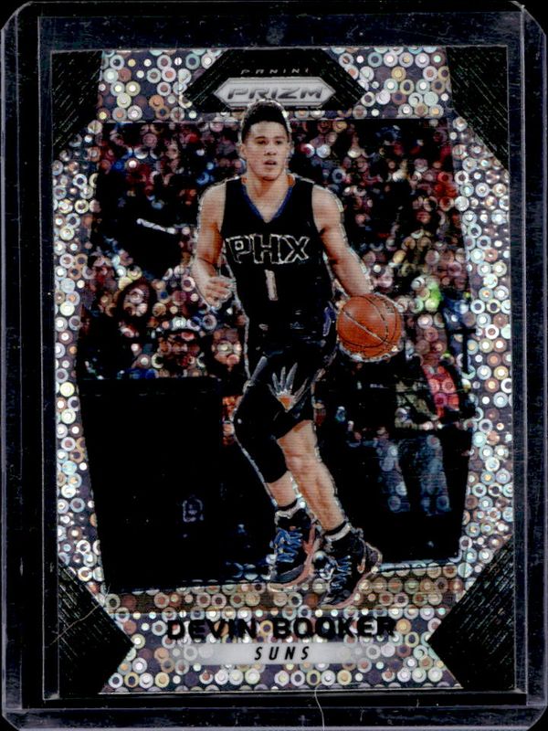 The Devin Booker 2017 Prizm #63 Fast Break card is 1 of 36 Devin Booker's card variations in the 2017 Prizm set being tracked by Sports Card Investor, including Base, Green, Hyper, Red White Blue, and Ruby Wave.