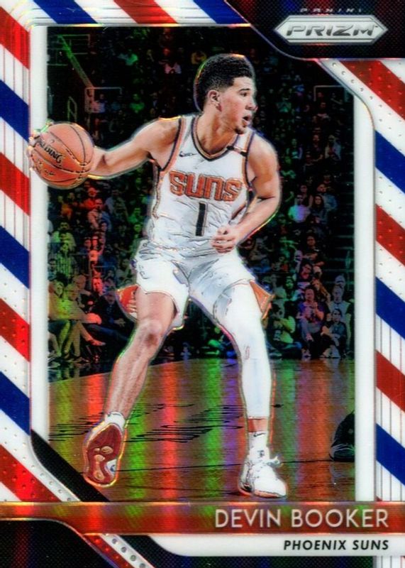 The Devin Booker 2018 Prizm #11 Red White Blue card in Raw condition has moved down -$0.85 (-45.9%) in the last 30 days and was last sold for $1.00 .