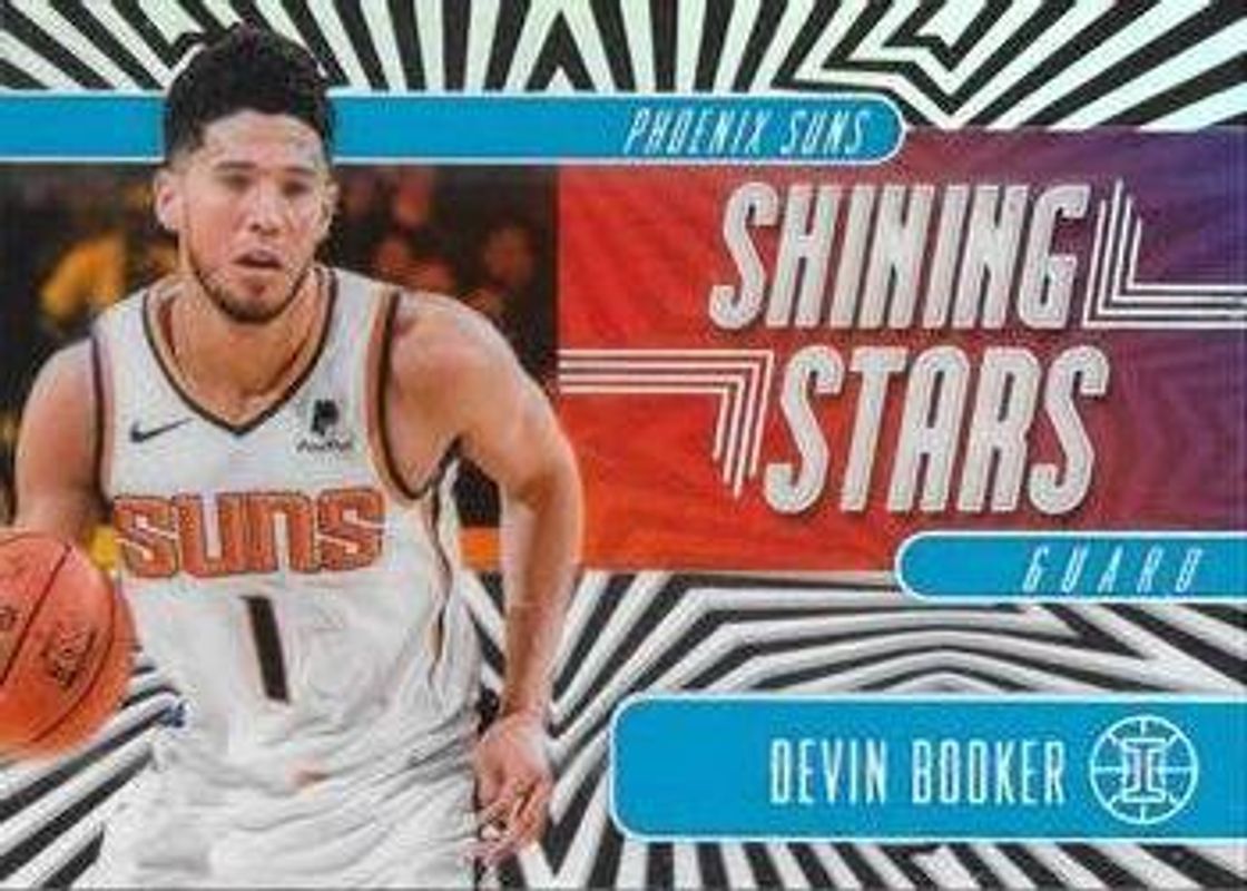 The Devin Booker 2019 Illusions #16 Shining Stars - Sapphire card is 1 of 53 Devin Booker's card variations in the 2019 Illusions set being tracked by Sports Card Investor, including Base, Trophy Collection Bronze, Trophy Collection Emerald, Trophy Collection Orange, and Trophy Collection Pink.