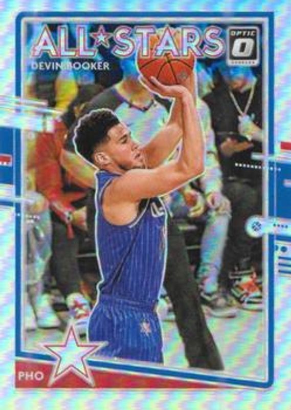The Devin Booker 2020 Optic #9 All-Stars - Holo card is 1 of 130 Devin Booker's card variations in the 2020 Optic set being tracked by Sports Card Investor, including Base, Blue Pulsar, Blue Velocity, Checkerboard, and Choice Red & Green.