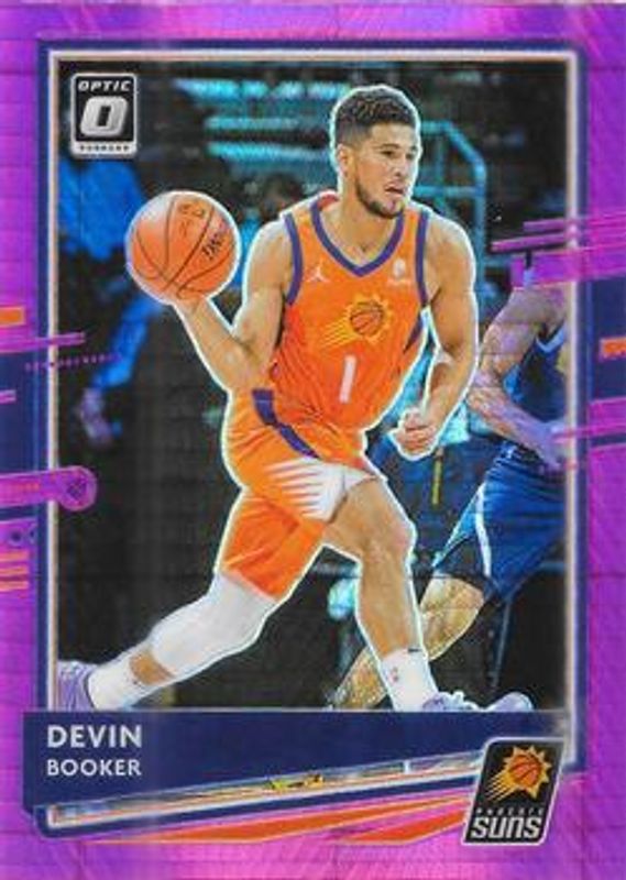 The Devin Booker 2020 Optic #122 Hyper Pink card is 1 of 130 Devin Booker's card variations in the 2020 Optic set being tracked by Sports Card Investor, including Base, Blue Pulsar, Blue Velocity, Checkerboard, and Choice Red & Green.
