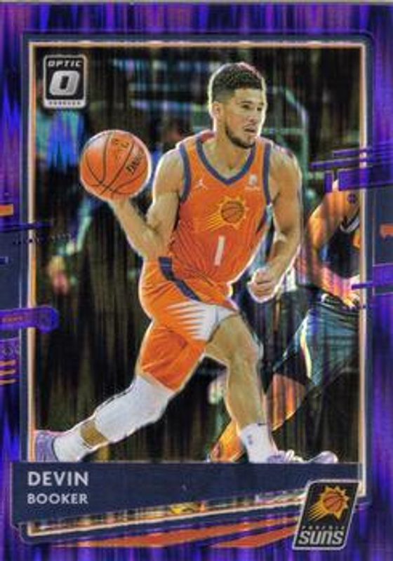 The Devin Booker 2020 Optic #122 Purple Shock card is 1 of 130 Devin Booker's card variations in the 2020 Optic set being tracked by Sports Card Investor, including Base, Blue Pulsar, Blue Velocity, Checkerboard, and Choice Red & Green.