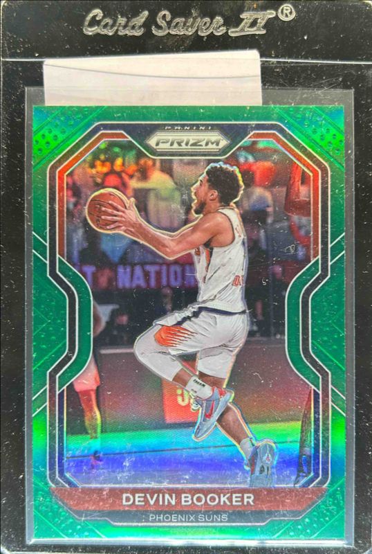 The Devin Booker 2020 Prizm #214 Green card is 1 of 66 Devin Booker's card variations in the 2020 Prizm set being tracked by Sports Card Investor, including Choice Blue Yellow Green, Fast Break, Green Ice, Hyper, and Orange Ice.