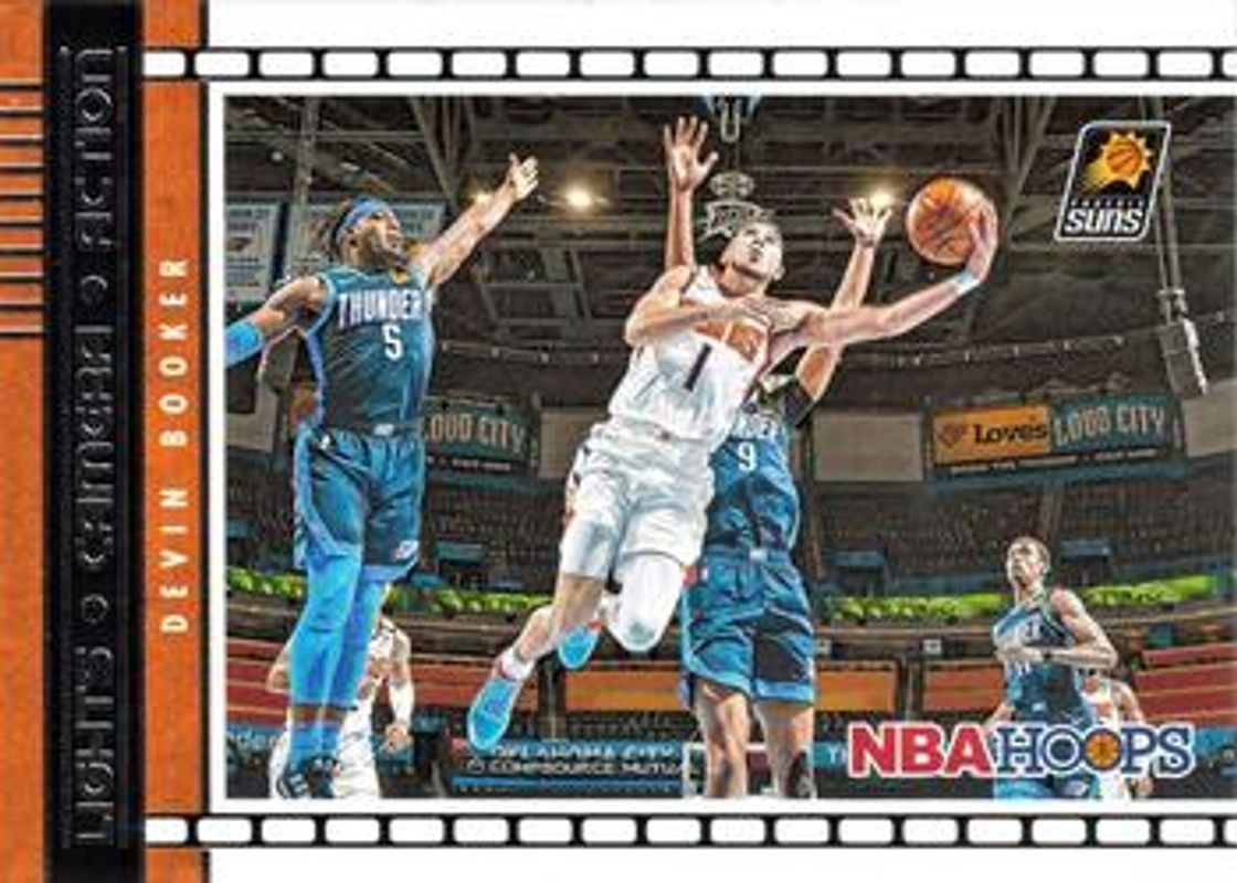 The Devin Booker 2021 Hoops #27 Lights Camera Action card is 1 of 58 Devin Booker's card variations in the 2021 Hoops set being tracked by Sports Card Investor, including Base, Anniversary Edition, Blue, Green Ice, and Hyper Blue.