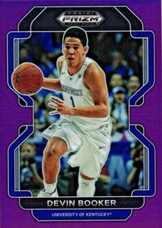 The Devin Booker 2022 Prizm Draft Picks #13 Purple /75 card is 1 of 76 Devin Booker's card variations in the 2022 Prizm Draft Picks set being tracked by Sports Card Investor, including Base, Blue Circles, Choice Blue Yellow & Green, Choice Tiger Stripe, and Green.