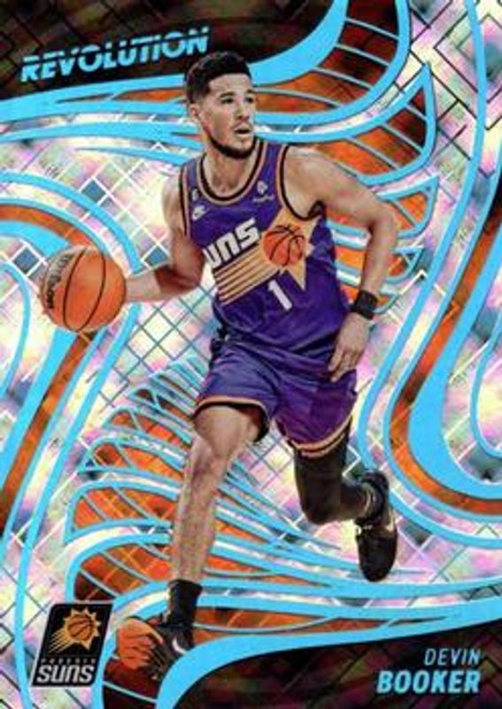 The Devin Booker 2022 Revolution #67 Cosmic /99 card is 1 of 33 Devin Booker's card variations in the 2022 Revolution set being tracked by Sports Card Investor, including Base, Asia Red, Astro, Chinese New Year, and Fractal.