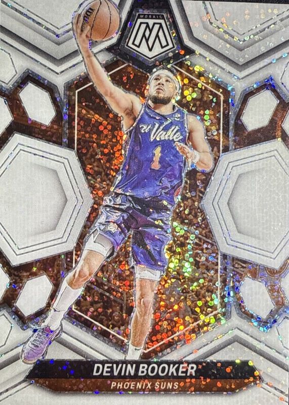 This card is 1 of 16 Devin Booker's card variations in the 2023 Mosaic set being tracked by Sports Card Investor, including Choice Peacock /(SSP), Genesis /(SSP), Glitter /(SSP), Fast Break Gold /10, and Gold /10.