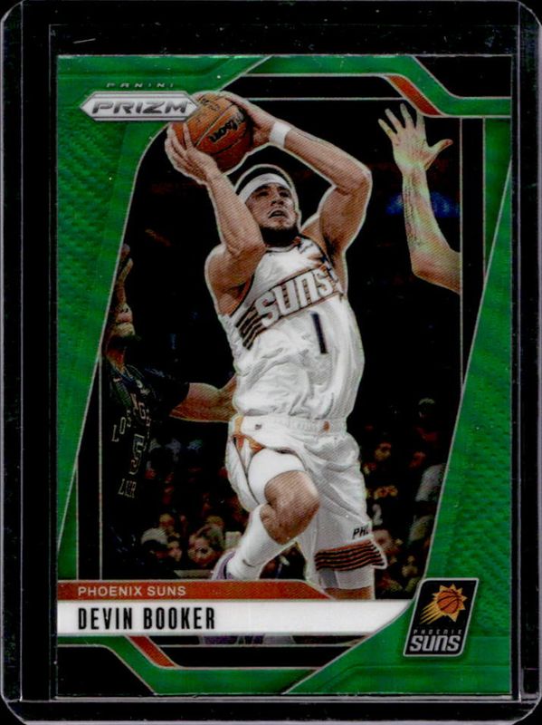 The Devin Booker 2024 Prizm #8 Green card is 1 of 74 Devin Booker's card variations in the 2024 Prizm set being tracked by Sports Card Investor, including Base, Green Ice, Green Wave, Hyper, and Ice.