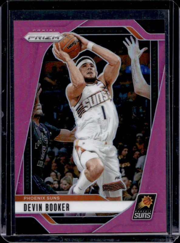The Devin Booker 2024 Prizm #8 Pink /249 card is 1 of 74 Devin Booker's card variations in the 2024 Prizm set being tracked by Sports Card Investor, including Base, Green, Green Ice, Green Wave, and Hyper.