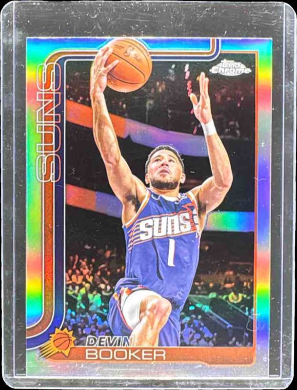 The Devin Booker 2025 Topps Chrome #195 Refractor card is 1 of 127 Devin Booker's card variations in the 2025 Topps Chrome set being tracked by Sports Card Investor, including Base, Basketball Refractor, Box Set Refractor, Image Variation, and Lightboard Logo Refractor.