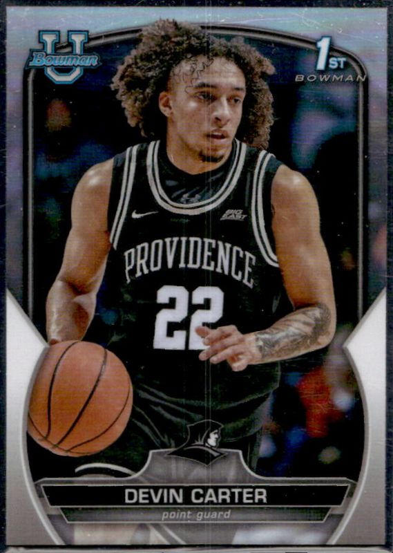 The Devin Carter 2022 Bowman Chrome University #6 Refractor card is 1 of 38 Devin Carter's card variations in the 2022 Bowman Chrome University set being tracked by Sports Card Investor, including Base, Pink Refractor, Purple Shimmer Refractor, Shimmer Refractor, and Purple Mini-Diamond Refractor /399.