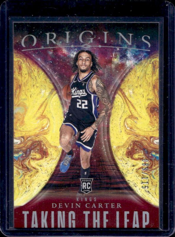 The Devin Carter 2024 Origins #6 Taking the Leap - Maroon /115 Rookie card is 1 of 64 Devin Carter's card variations in the 2024 Origins set being tracked by Sports Card Investor, including Base, Basketballs, Cosmos, Tessellated, and Red /299.