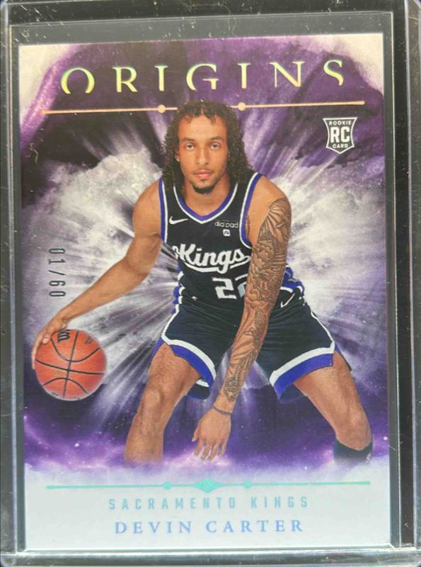 The Devin Carter 2024 Origins #99 White /60 Rookie card is 1 of 64 Devin Carter's card variations in the 2024 Origins set being tracked by Sports Card Investor, including Base, Basketballs, Cosmos, Tessellated, and Red /299.