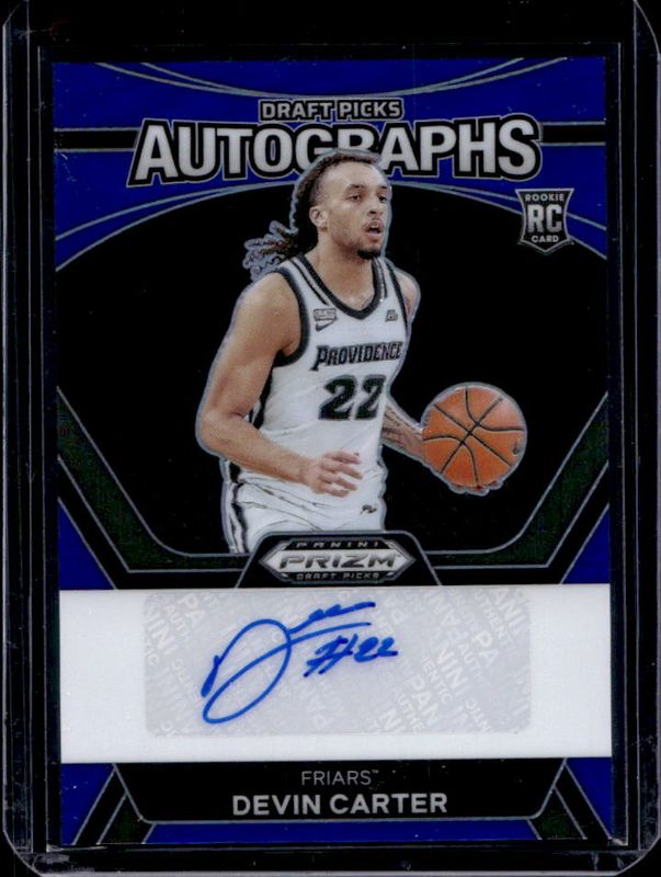 The Devin Carter 2024 Prizm Draft Picks #DPA-DVC Draft Picks Autographs - Blue /149 Rookie card is 1 of 112 Devin Carter's card variations in the 2024 Prizm Draft Picks set being tracked by Sports Card Investor, including #27b Base, #27 Base, #27 Green, #27b Green, and #27b Green Wave.