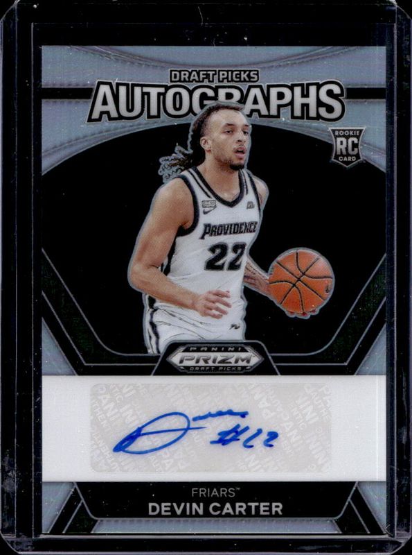 The Devin Carter 2024 Prizm Draft Picks #DPA-DVC Draft Picks Autographs - Silver Rookie card is 1 of 112 Devin Carter's card variations in the 2024 Prizm Draft Picks set being tracked by Sports Card Investor, including #27b Base, #27 Base, #27 Green, #27b Green, and #27b Green Wave.