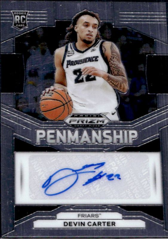 The Devin Carter 2024 Prizm Draft Picks #P-DVC Penmanship Rookie card is 1 of 112 Devin Carter's card variations in the 2024 Prizm Draft Picks set being tracked by Sports Card Investor, including #27b Base, #27 Base, #27 Green, #27b Green, and #27b Green Wave.