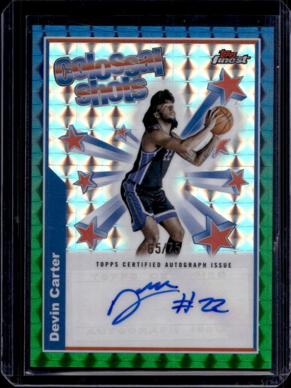 The Devin Carter 2024 Topps Finest #BSA-DC Colossal Shots Autographs - Green Geometric Refractor /75 Rookie card is 1 of 116 Devin Carter's card variations in the 2024 Topps Finest set being tracked by Sports Card Investor, including Arrivals, Arrivals - Geometric Refractor, Arrivals - Refractor, Arrivals - X-Fractor, and Base Common.