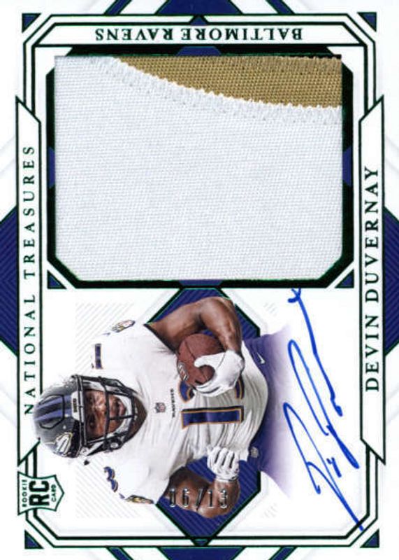 This card is 1 of 13 Devin Duvernay's card variations in the 2020 National Treasures set being tracked by Sports Card Investor, including Rookie Patch Auto /99, Rookie Patch Auto - Holo Silver /25, Rookie Patch Auto - Midnight /20, Rookie Patch Auto - Stars & Stripes /20, and Rookie Patch Auto - Holo Gold /10.