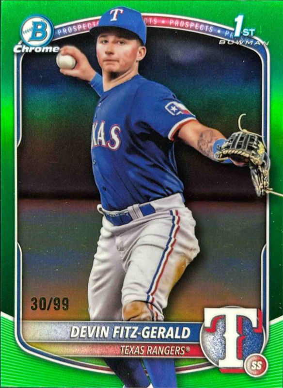 This card is 1 of 86 Devin Fitz-Gerald's card variations in the 2025 Bowman Chrome set being tracked by Sports Card Investor, including Prospect Auto (1st), Prospect Auto - Black & White Shimmer Refractor (1st), Prospects (1st), Prospects - Mini-Diamond Refractor (1st), and Prospects - Shimmer Refractor (1st).