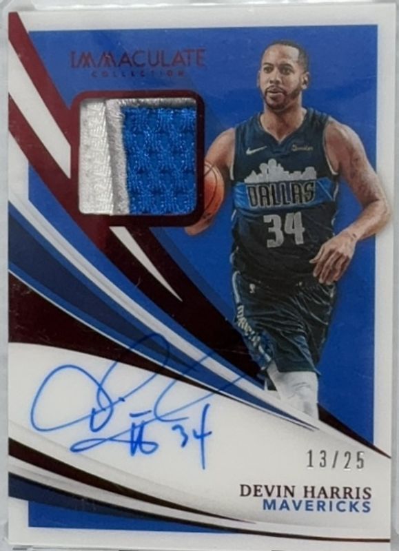 The Devin Harris 2020 Immaculate #PA-DHA Patch Autographs - Red /25 card is 1 of 11 Devin Harris' card variations in the 2020 Immaculate set being tracked by Sports Card Investor, including Premium Patch Autographs, Premium Patch Autographs - Gold, Premium Patch Autographs - Red, Patch Autographs /50, and Patch Autographs - Jersey Number /23.