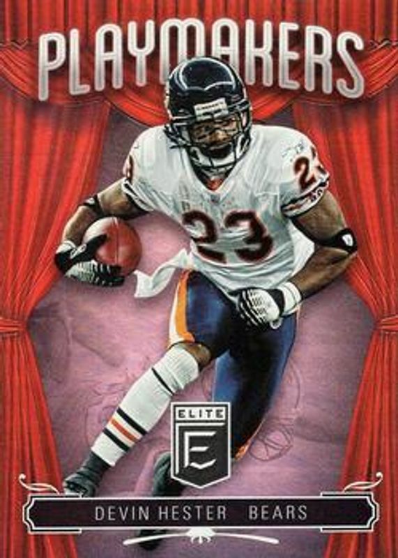 The Devin Hester 2019 Elite #PM-12 Playmakers card is 1 of 5 Devin Hester's card variations in the 2019 Elite set being tracked by Sports Card Investor, including Passing the Torch Signatures Singles /10, Playmakers - Gold /10, Passing the Torch Signatures Singles - Black /1, and Playmakers - Black /1.