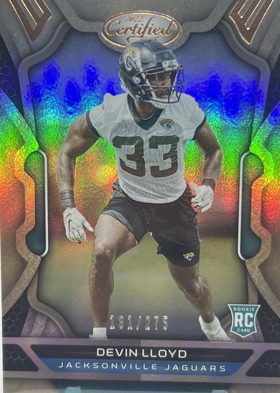 The Devin Lloyd 2022 Certified #145 Mirror Bronze /275 Rookie card in Raw condition has moved up $1.51 (+153%) in the last 30 days and was last sold for $2.50 .