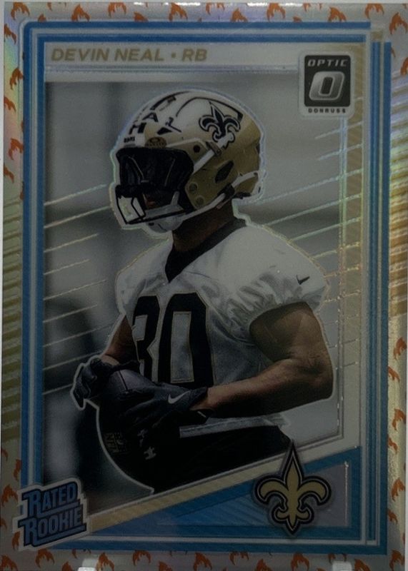 The Devin Neal 2025 Optic #282 Fire /(SSP) Rookie card in Raw condition has moved down -$4.51 (-82.0%) in the last 30 days and was last sold for $0.99 .