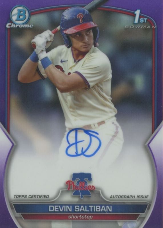 Best Prices Available For Sale of Devin Saltiban 2023 Bowman Draft #CDA-DS Chrome DP Auto - Purple Refractor /250 (1st)