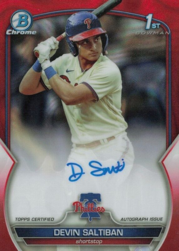 Auctions Ending Soon for Devin Saltiban 2023 Bowman Draft #CDA-DS Chrome DP Auto - Red Lava Refractor /5 (1st) RAW