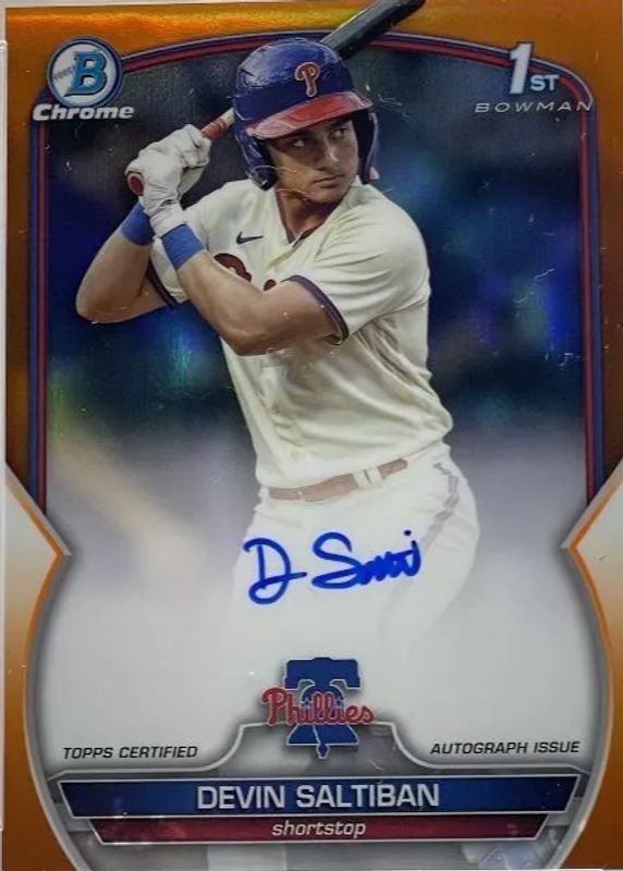 Auctions Ending Soon for Devin Saltiban 2023 Bowman Draft #CDA-DS Chrome Prospect Auto - Orange Refractor /25 (1st) RAW