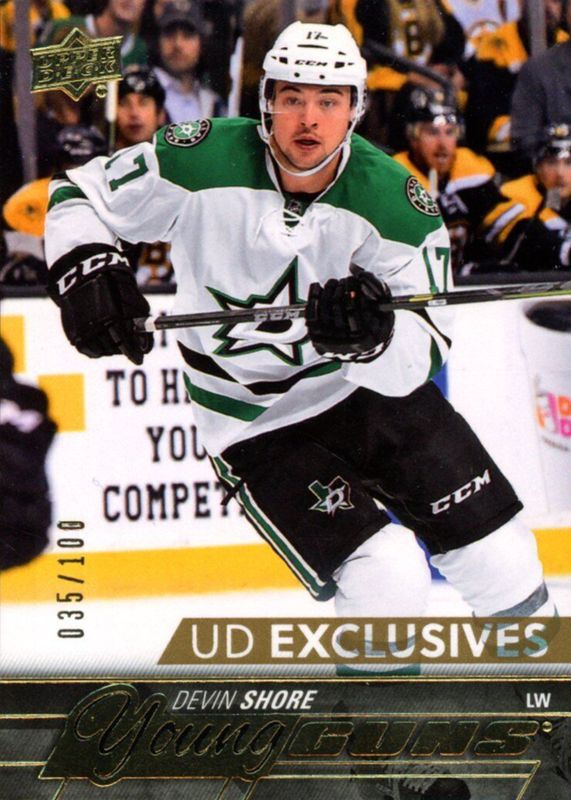 The Devin Shore 2015 Upper Deck #489 Young Guns - UD Exclusives /100 Rookie card in Raw condition has not changed in price in the last 30 days and was last sold for $1.55 .