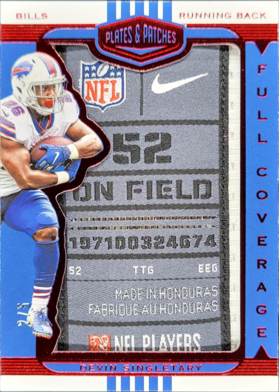The Devin Singletary 2019 Plates & Patches #FC13 Full Coverage Relics - Red /5 Rookie card is 1 of 31 Devin Singletary's card variations in the 2019 Plates & Patches set being tracked by Sports Card Investor, including Base /99, Blue /60, Purple /35, Green /25, and Red /10.