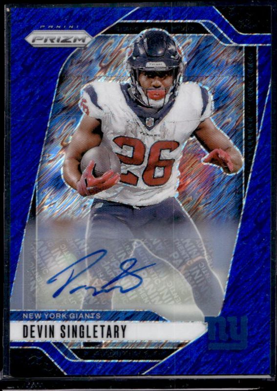 The Devin Singletary 2024 Prizm #213 Base Autographs - Blue Shimmer /25 card is 1 of 84 Devin Singletary's card variations in the 2024 Prizm set being tracked by Sports Card Investor, including Base, Choice Blue Yellow Green, Choice Silver, Disco, and Green.