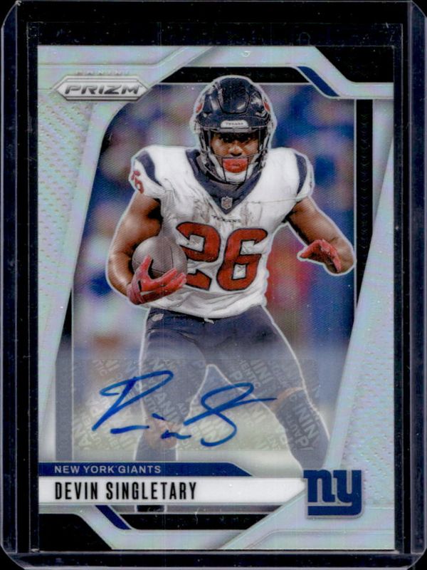 The Devin Singletary 2024 Prizm #213 Base Autographs - Silver card is 1 of 84 Devin Singletary's card variations in the 2024 Prizm set being tracked by Sports Card Investor, including Base, Choice Blue Yellow Green, Choice Silver, Disco, and Green.