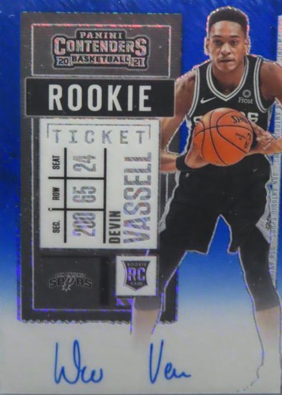 The Devin Vassell 2020 Contenders #119 Rookie Ticket Auto - Premium Blue Shimmer /20 (Black Jersey) card in Raw condition has not changed in price in the last 30 days and was last sold for $238.25 .