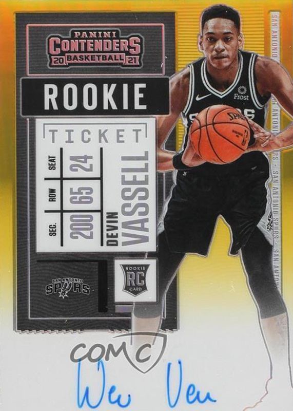 The Devin Vassell 2020 Contenders #119 Rookie Ticket Auto - Premium Gold /10 (Black Jersey) card in Raw condition has not changed in price in the last 30 days and was last sold for $1,580.00 .