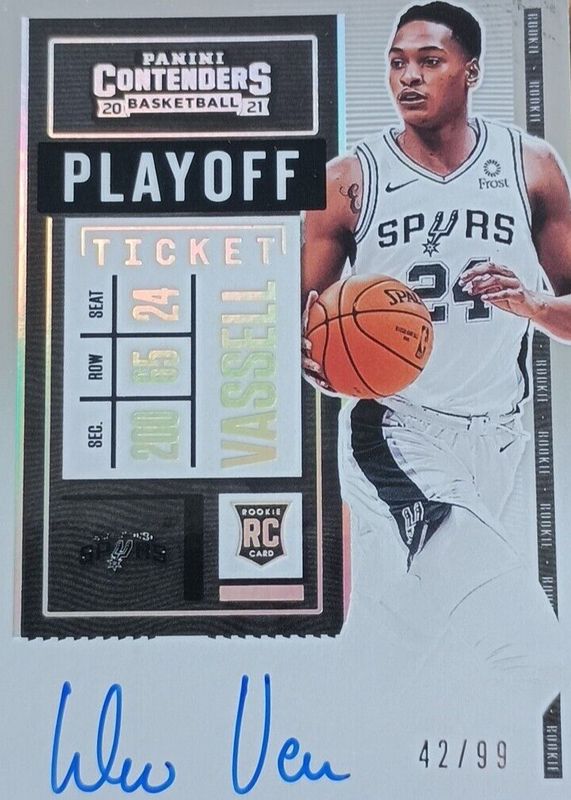 The Devin Vassell 2020 Contenders #119 Rookie Ticket Auto Variation - Playoff Ticket /99 (White Jersey) card in Raw condition has not changed in price in the last 30 days and was last sold for $76.00 .