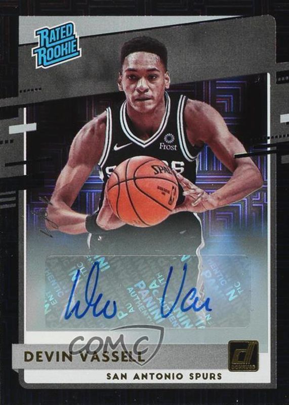 The Devin Vassell 2020 Donruss #206 Rated Rookie Signatures - Choice Black /1 card in Raw condition has not changed in price in the last 30 days and was last sold for $712.00 .