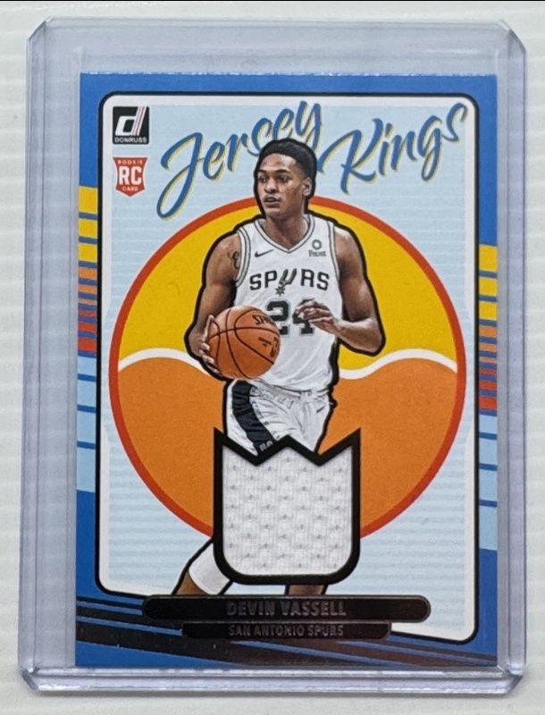 The Devin Vassell 2020 Donruss #RJ-DVS Rookie Jersey Kings card is 1 of 51 Devin Vassell's card variations in the 2020 Donruss set being tracked by Sports Card Investor, including Base, Choice, Green Flood, Green Laser, and Green & Yellow Laser.