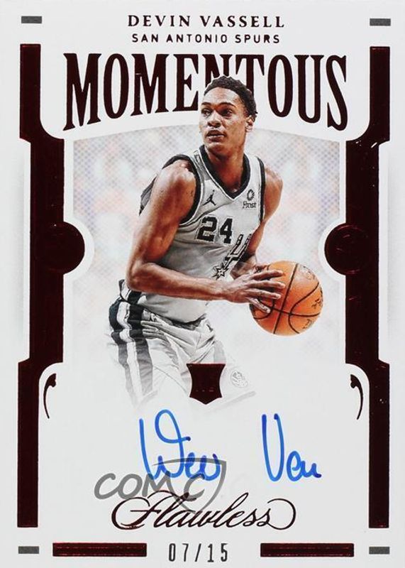 The Devin Vassell 2020 Flawless #MOM-VAS Momentous Autographs - Ruby /15 Rookie card in Raw condition has not changed in price in the last 30 days and was last sold for $158.50 .