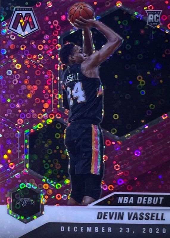 The Devin Vassell 2020 Mosaic #278 NBA Debut - Fast Break Pink /20 Rookie card in Raw condition has not changed in price in the last 30 days and was last sold for $27.00 .