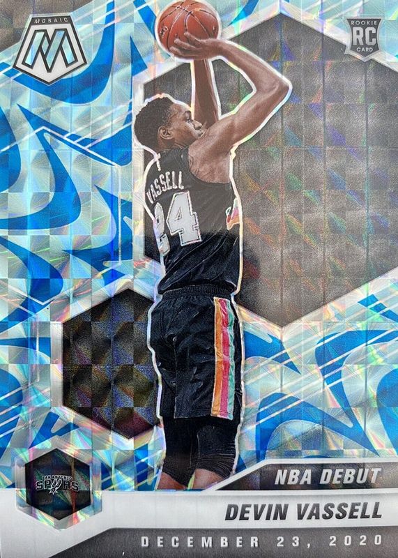 The Devin Vassell 2020 Mosaic #278 NBA Debut - Reactive Blue Rookie card in Raw condition has not changed in price in the last 30 days and was last sold for $3.25 .