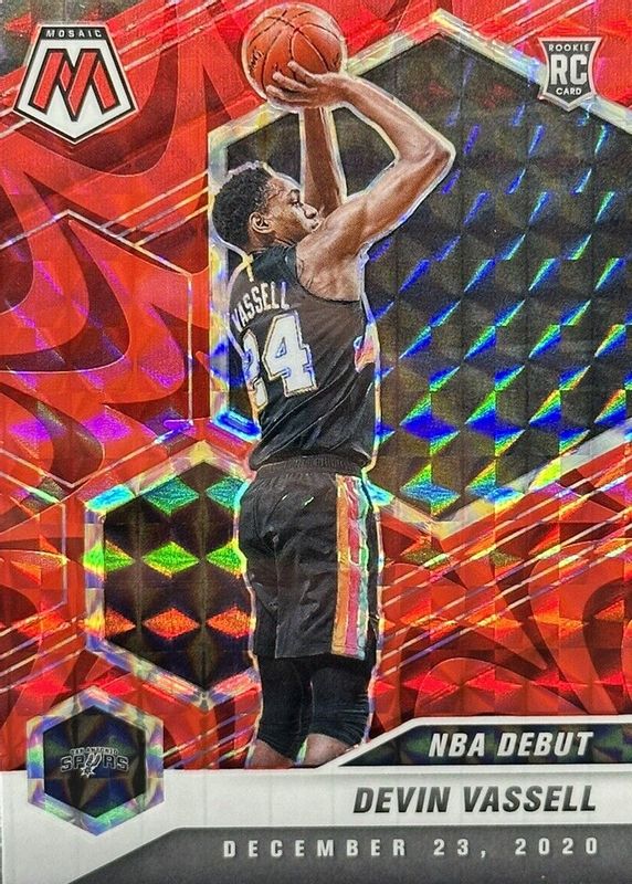 The Devin Vassell 2020 Mosaic #278 NBA Debut - Reactive Red Rookie card in Raw condition has not changed in price in the last 30 days and was last sold for $1.99 .