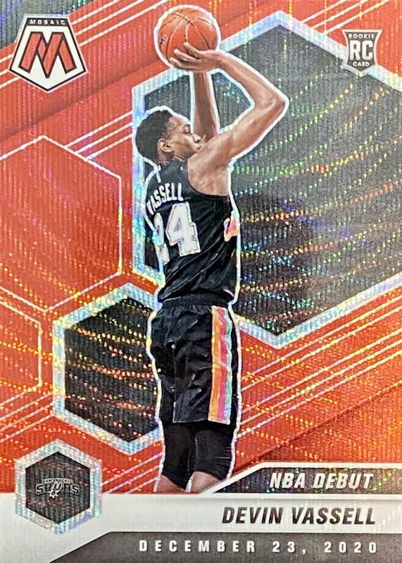The Devin Vassell 2020 Mosaic #278 NBA Debut - Red Wave Rookie card in Raw condition has not changed in price in the last 30 days and was last sold for $0.99 .