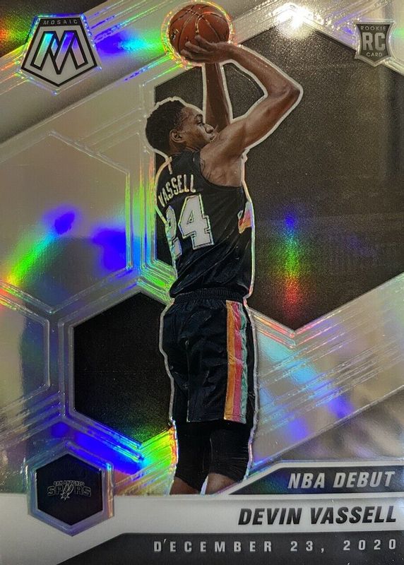 The Devin Vassell 2020 Mosaic #278 NBA Debut - Silver Rookie card in Raw condition has not changed in price in the last 30 days and was last sold for $0.99 .