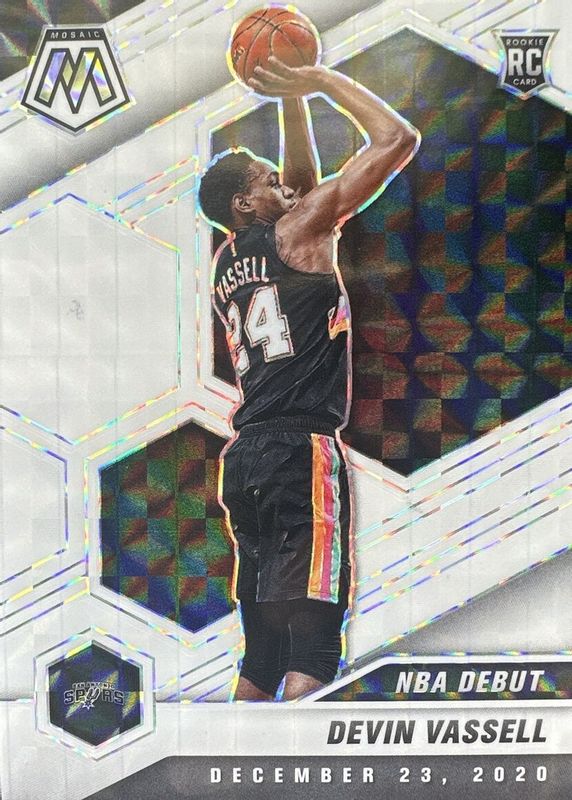 The Devin Vassell 2020 Mosaic #278 NBA Debut - White /25 Rookie card in Raw condition has not changed in price in the last 30 days and was last sold for $38.00 .