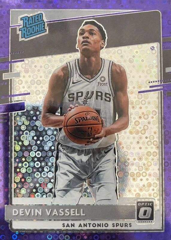 The Devin Vassell 2020 Optic #161 Fast Break Purple /95 Rookie card in Raw condition has not changed in price in the last 30 days and was last sold for $14.07 .