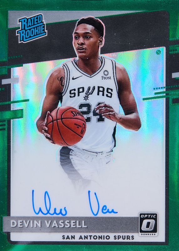 The Devin Vassell 2020 Optic #161 Rated Rookie Signatures - Black /1 card in Raw condition has not changed in price in the last 30 days and was last sold for $202.50 .