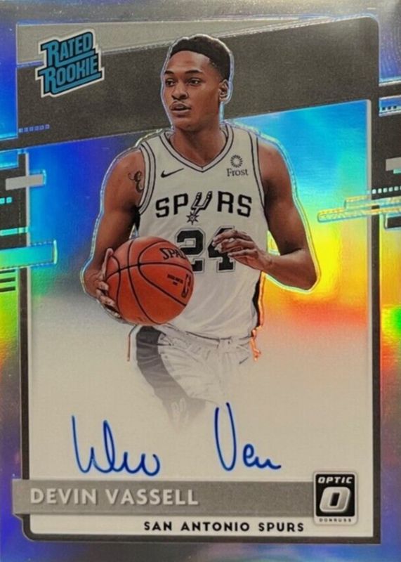 The Devin Vassell 2020 Optic #161 Rated Rookie Signatures - Holo card in Raw condition has not changed in price in the last 30 days and was last sold for $21.51 .
